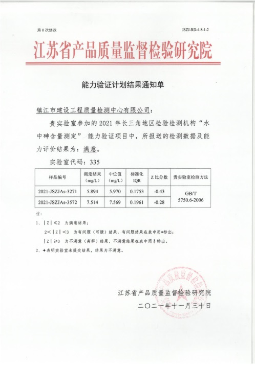 為加強檢驗檢測機構(gòu)監(jiān)督管理,推動長三角檢驗檢測高質(zhì)量一體化發(fā)展,蘇滬浙皖市場監(jiān)管局聯(lián)合組織開展了2021年長三角地區(qū)檢驗檢測機構(gòu)能力驗證工作。檢測中心參加了能力驗證項目“水中砷的測定”,提交的結(jié)果評價為“滿意”。